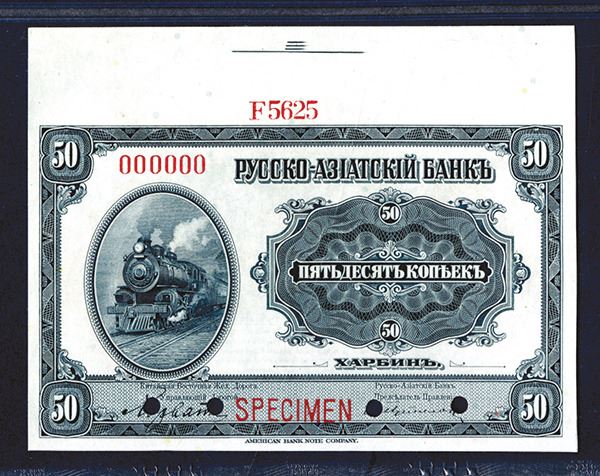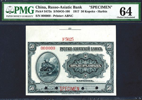 Harbin, China, ND (1917), 50 Kopecks, P-S473s, Specimen banknote, S/N 000000, large excess top margin with order # F5625, Specimen overprints, POC's, PMG graded Choice Uncirculated 64. ABNC.