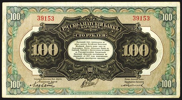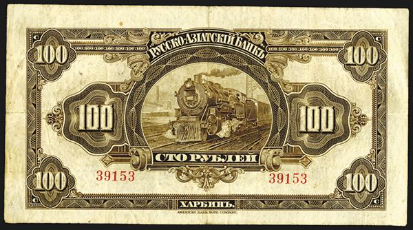 China, 100 Rubles, P-S478, S/M#O5-105, Issued banknote, black on tan, green and m/c, back brown with locomotive, S/N 39153, VF to VF+, Attractive note. ABNC.