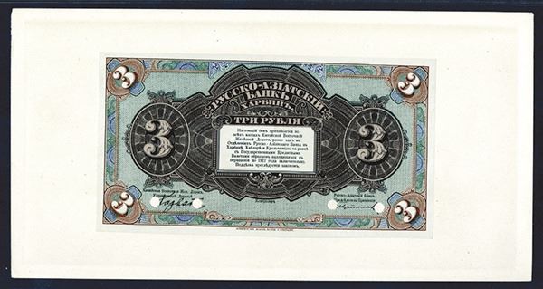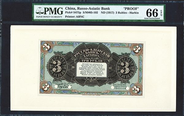 Harbin, Russia, 3 Rubles, P-S475p S/M #O5-102, Proof banknote printed on india paper on large card, Face only, no back, PMG graded Gem Uncirculated 66 EPQ, amazing rarity and exceptional condition, rarely offered at auction in proof. ABNC. Only 5 graded in the PMG census.