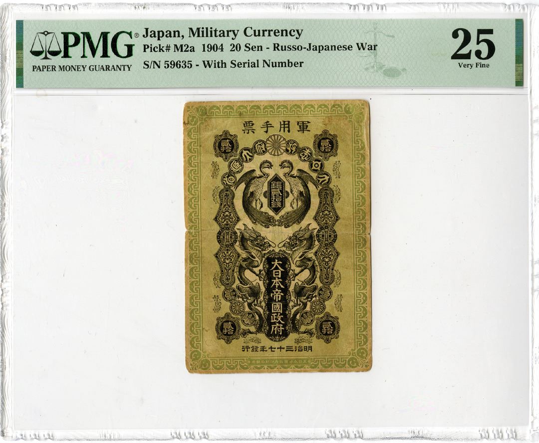 Japan, 1904. 20 Sen, P-M2a, Issued Banknote, Black on green underprint, S/N 59635, PMG graded Very Fine 25