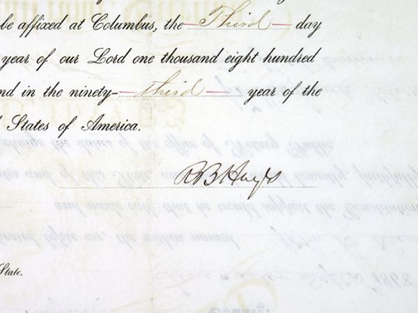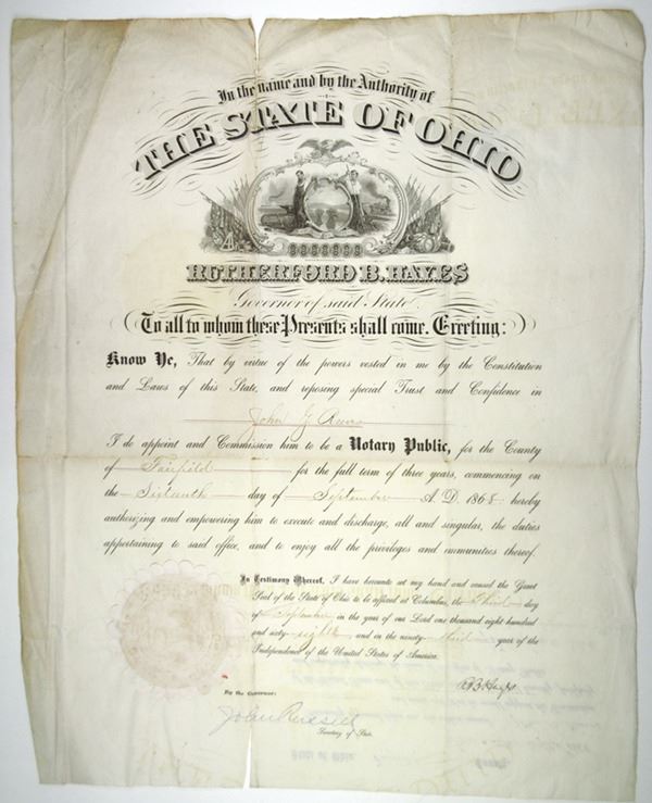Ohio. State of Ohio Notary Public Appointment, 1p, 17.5 x 14 inches. Columbus, Ohio, September 3, 1868. The certificate has a 4 inch tear on the top left vertical fold and 2 inch tear on the lower left vertical fold with foxing on the left. Signature is strong and clear.