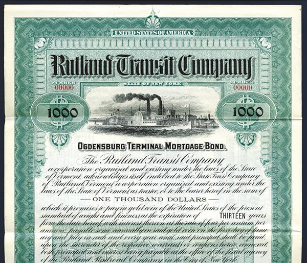 New York. 1901. $1000 4% Specimen Bond. Black print with green border and underprint. Steamship top center with city behind it . POC's and red SPECIMEN overprint. VF condition. ABNC. Listed railroad and bond in Cox.