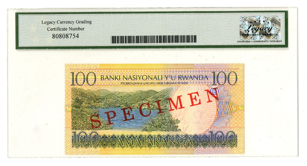Rwanda, 2003. 100 Francs, P-29s, Specimen banknote, Green and m/c with child riding cattle at center, Back is m/c with lake and scenery at center, S/N XX0000000 000853, LCG graded Superb Gem New 67 PPQ. Very high grade, Rare. Tied with 3 other notes as highest graded out of 93 graded in the PMG census,.