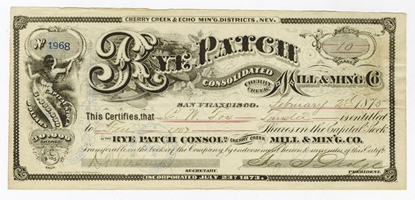 Cherry Creek & Echo Mountain Mining Districts, Nevada. 10 Shares, I/U, Black with ornate title pick, shovel and gold pan with woman holding up framed serial number at left, VF to Choice VF, rare and very attractive. Dodge was born in Vermont in 1838. In 1861 he was appointed Colonel in the QuartermasterÕs Department (Payroll). He was promoted to Brigadier General in January, 1865. He served as Consul to Germany after the War before heading to San Francisco. Dodge retired from the Eureka Consolidated by the late 1870Õs, and lived the life of a mining capitalist. He and his wife moved across the Bay, where he died in Oakland in 1881