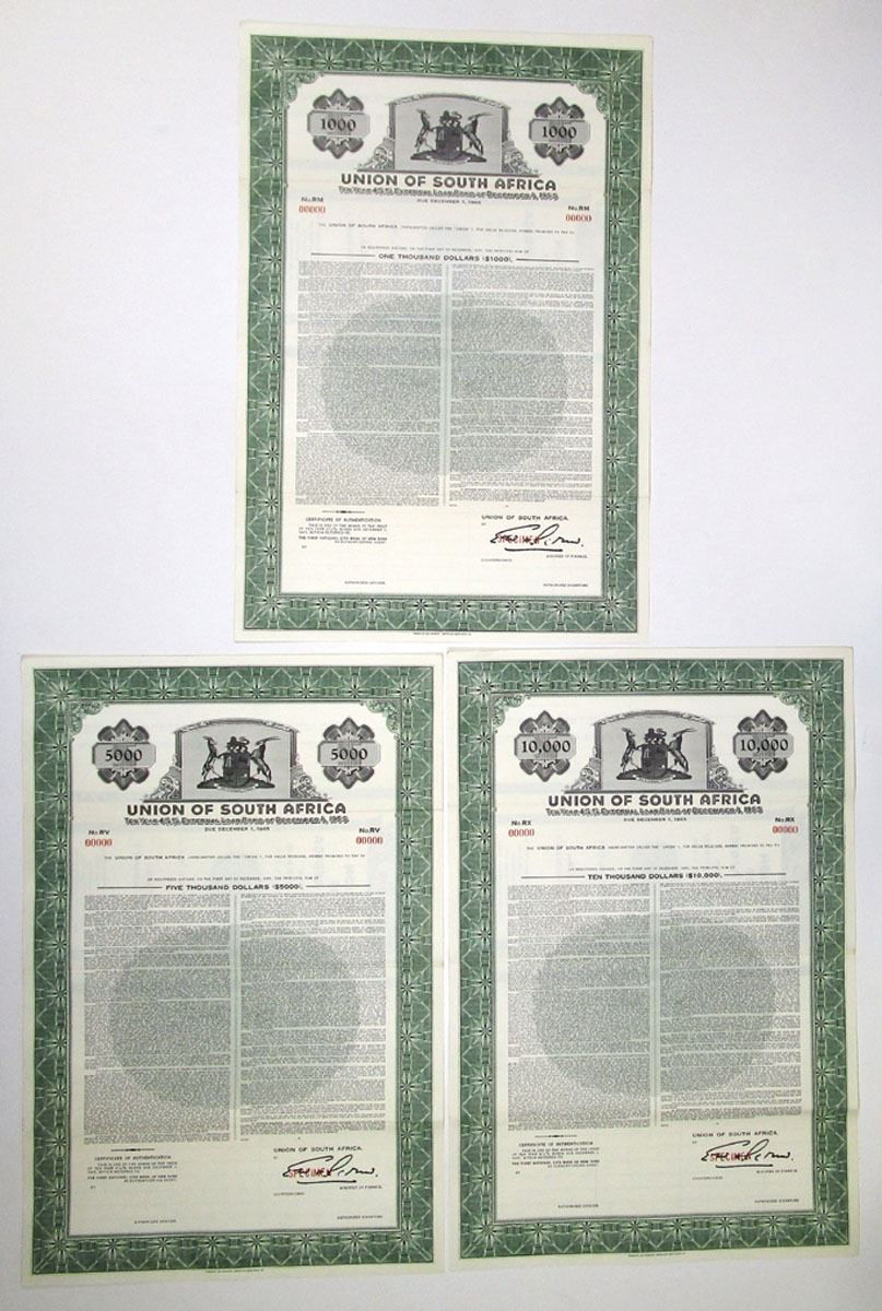 South Africa, 1955, Lot of 3 Specimen Bonds, Includes: $1000 Registered 4 1/4% Ten Year External Loan; $5000 Registered 4 1/4% Ten Year External Loan; $10,000 Registered 4 1/4% Ten Year External Loan. All have black print with green border and underprint, Arms of South Africa at top center, Specimen overprints, POCs, are in AU to UNC condition, and printed by Franklin Lee - ABNC. (3). Sold "AS IS" no returns accepted.