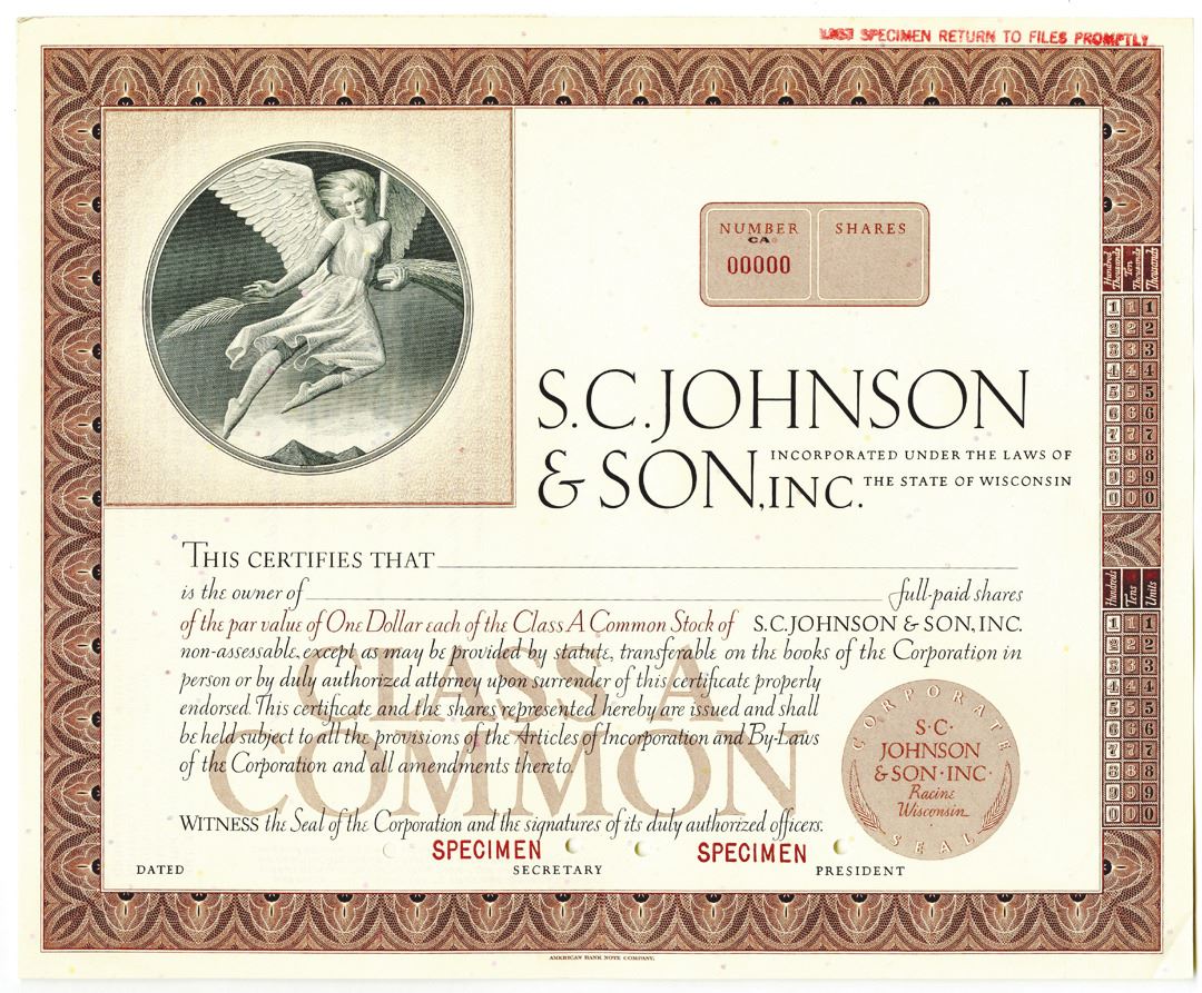 Wisconsin, ND (1960-1980s). Odd Shares Specimen Class A Stock Certificate, Black text with brown border and underprint, Allegorical angel at flight in top left corner. Red specimen overprints, 00000 serial number, and POCs. VF condition, ABNC. S. C. Johnson & Son, Inc. is an American multinational privately held manufacturer of household cleaning supplies and other consumer chemicals based in Racine, Wisconsin.