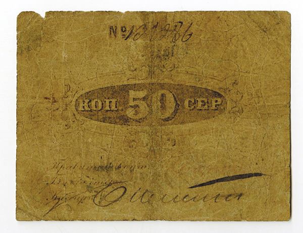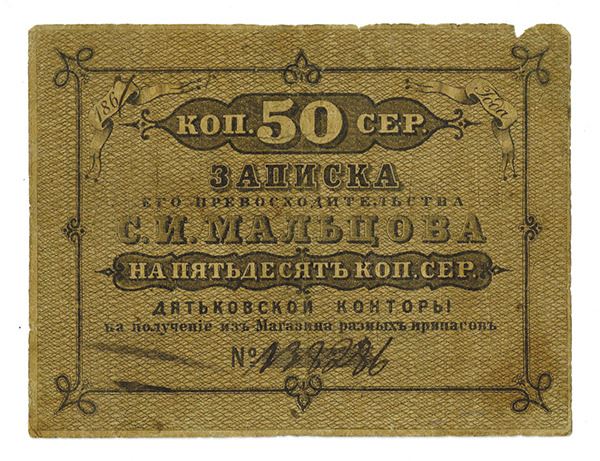 Dyatkovo, Russia,æ50 Kopeks, 1867 Pick UNL. The Maltsovsky factories were located on the Bolva River in the Bryansk Oblast. They were involved with iron foundries, machine plants, porcelain, glass, and paper factories. It was an early "Industrial Empire" which was created by Sergey Ivanovich Matlsov. Almost 20,000 inhabitants in his serfdom were employed by him. It was one of the most productive economic zones in Russia. Due to financial hardships in Russia in the 1850Ís and 1860Ís led to a shortage of cash, with a lack of even copper coins in circulation. Matlsov had to issue scrip to facilitate pay and trade in his district which had 20 or more factories at its height. Matlsov designated on the note as "His Excellency S.I. Matlsov." Rare note and only rumored to exist for many years. Numbered and dated in pen,æS/N 139286, Fine with a small nick on the top right margin.æ(www.Bonistikaweb.ru features an in depth article about these currency issues)æ