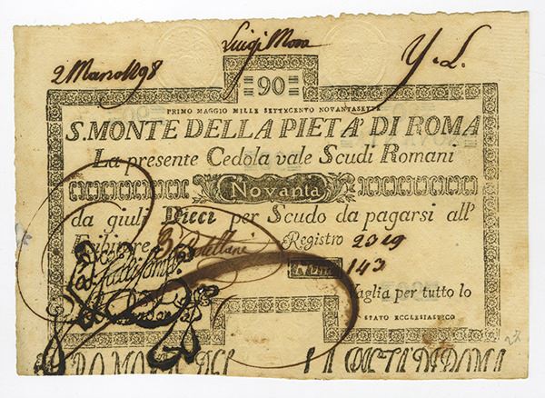 Italy, 1798, 90 Scudi, P-S356, Issued banknote, Choice XF to AU condition, Scarce note in high grade.