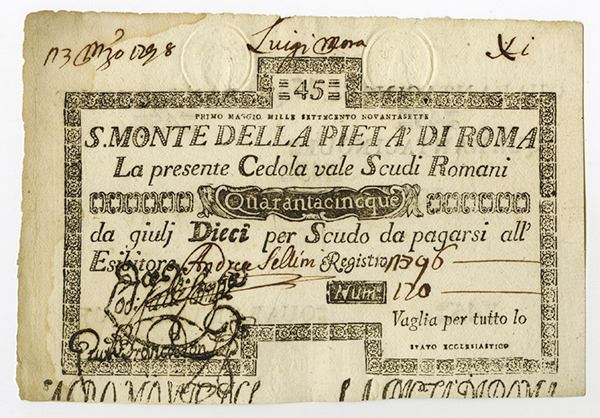 Italian States, 1798, 45 Scudi, P-S343, X with stains on left border, Scarce note in any condition and unlisted date in SCWPM.
