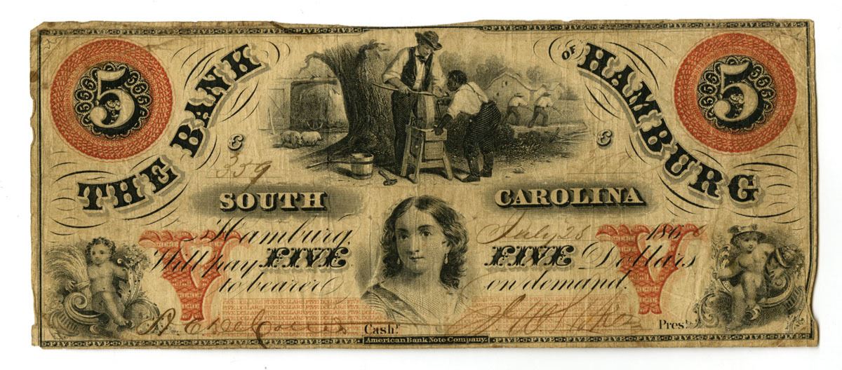 Hamburg, South Carolina, 1860. $5 I/U Banknote, Black and red print with simple black border, Multiple images on note, including slave and farmer sharpening tools and top and cherubs at bottom, S/N 359, Fine to VF condition. ABNC.
