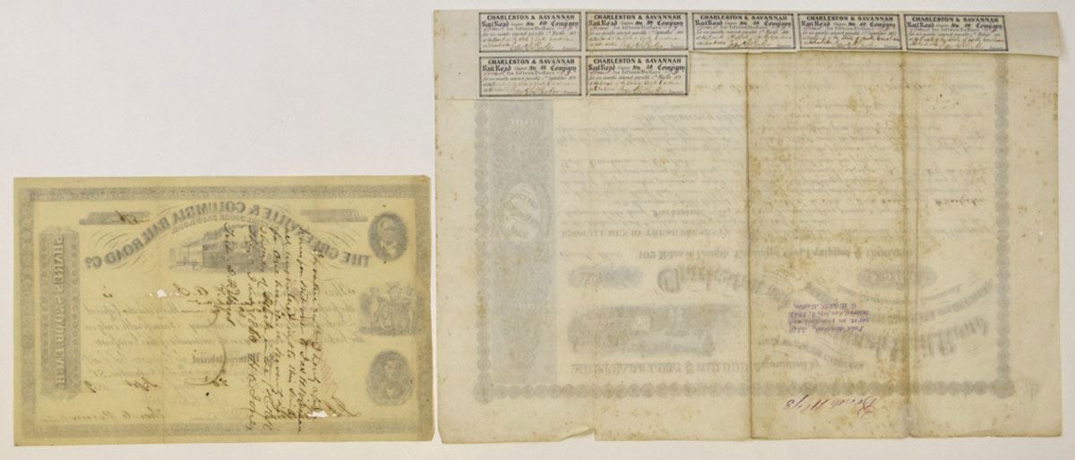 South Carolina, Lot of 2 Railroad Stock and Bond Certificates representing early Southern railroad finance, each with engraved locomotive vignettes, ornate borders, and printed company titles. Includes 1859, I/C, Greenville & Columbia Railroad Co., 176 Shares Capital Stock I/C Certificate; and, 1856, I/U, Charleston and Savannah Rail Road, $500 I/U 6% Mortgage Coupon Bond. Designs feature portrait medallions, allegorical figures, and state fiscal officer signatures. Choice Fine to VF condition. (2). Sold “AS IS” no returns accepted.