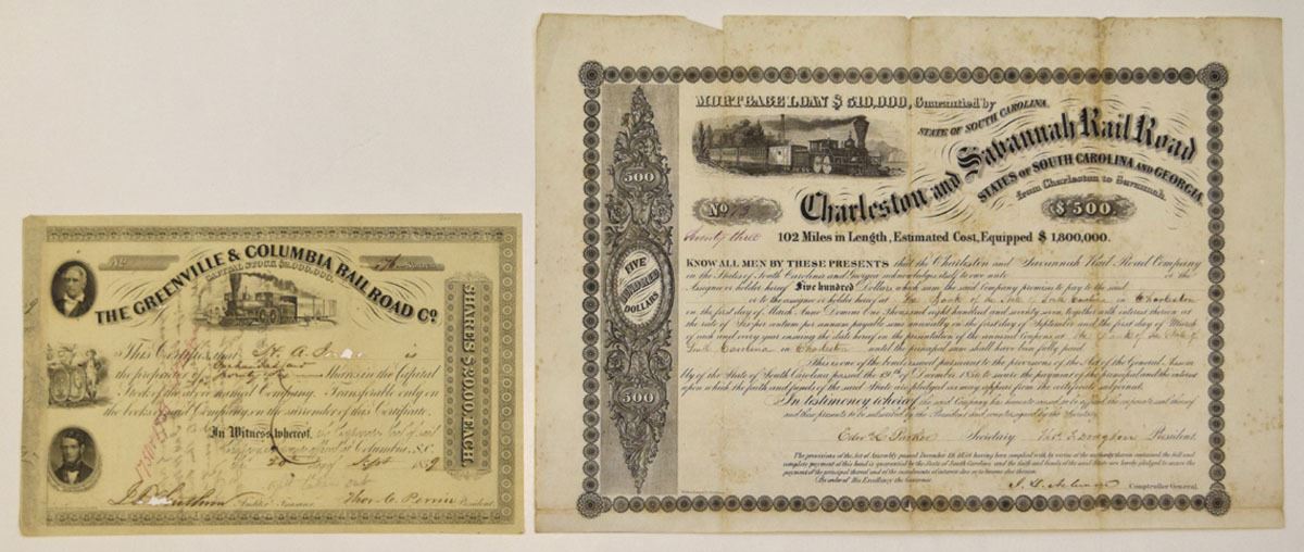South Carolina..., Lot of 2 Railroad Stock and Bond Certificates representing early Southern railroad finance, each with engraved locomotive vignettes, ornate borders, and printed company titles. Includes 1859, I/C, Greenville & Columbia Railroad Co., 176 Shares Capital Stock I/C Certificate; and, 1856, I/U, Charleston and Savannah Rail Road, $500 I/U 6% Mortgage Coupon Bond. Designs feature portrait medallions, allegorical figures, and state fiscal officer signatures. Choice Fine to VF condition. (2). Sold “AS IS” no returns accepted.