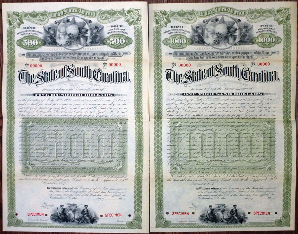 South Carolina. Lot of 2 specimen bonds. Includes: $500 Specimen 4.5% Redemption of Deficiency Coupon Bond in green; and, $1000 Specimen 4.5% Redemption of Deficiency Coupon Bond in green. Both have red specimen overprints, 00000 serial numbers, and POCs. VF condition, ABNC. (2)
