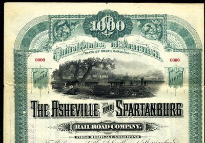 South Carolina. 1883. $1,000. Specimen 1st Mortgage 6% Gold Bond. Green border. Speeding locomotive passing cattle on left with harbor scene in background. Red specimen overprints, POC's and "00000" serial numbers. Coupons attached. XF condition. Rare South Carolina bond. ABNC