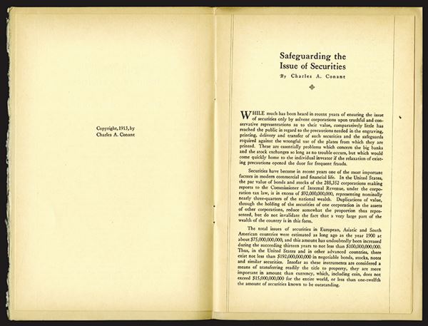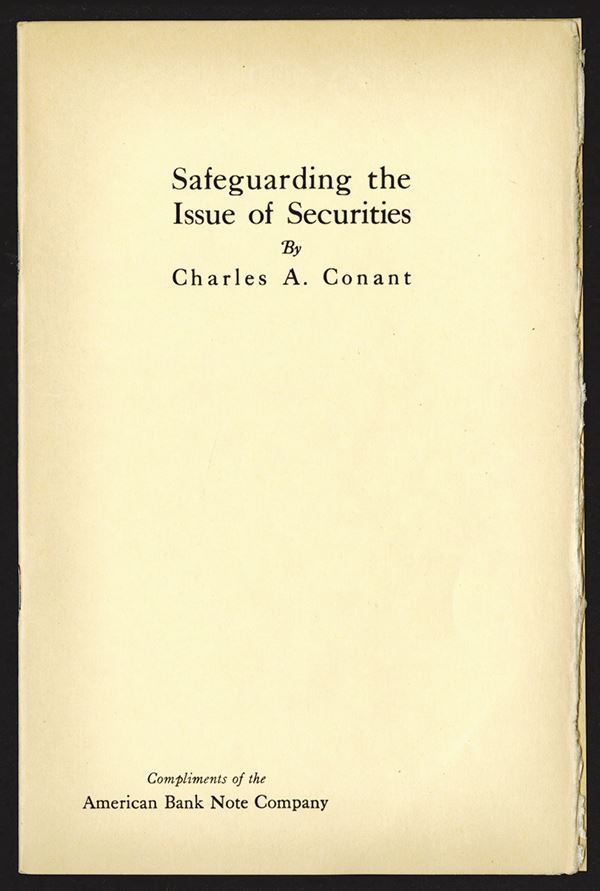 1913, "Safeguarding the Issue of Securities" 9 page booklet written by Charles A. Conant, Original published in the Financial and Commercial Chronicle, VF condition with some wear around the edges.