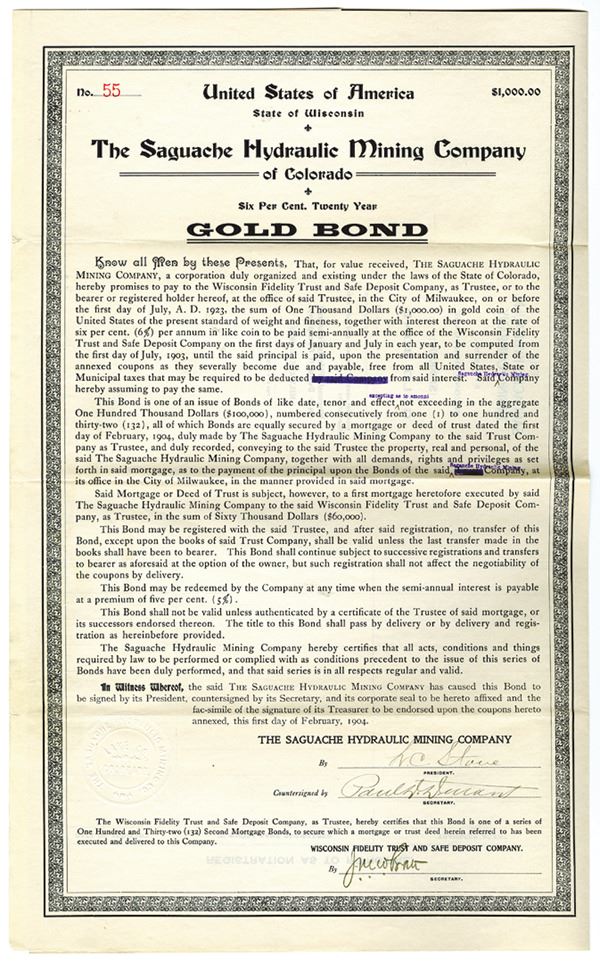 Colorado (Inc. in Wisconsin). 1904, Saguache Hydraulic Mining Company of Colorado, $1000 6% Gold Bond. S/N 55, VF.