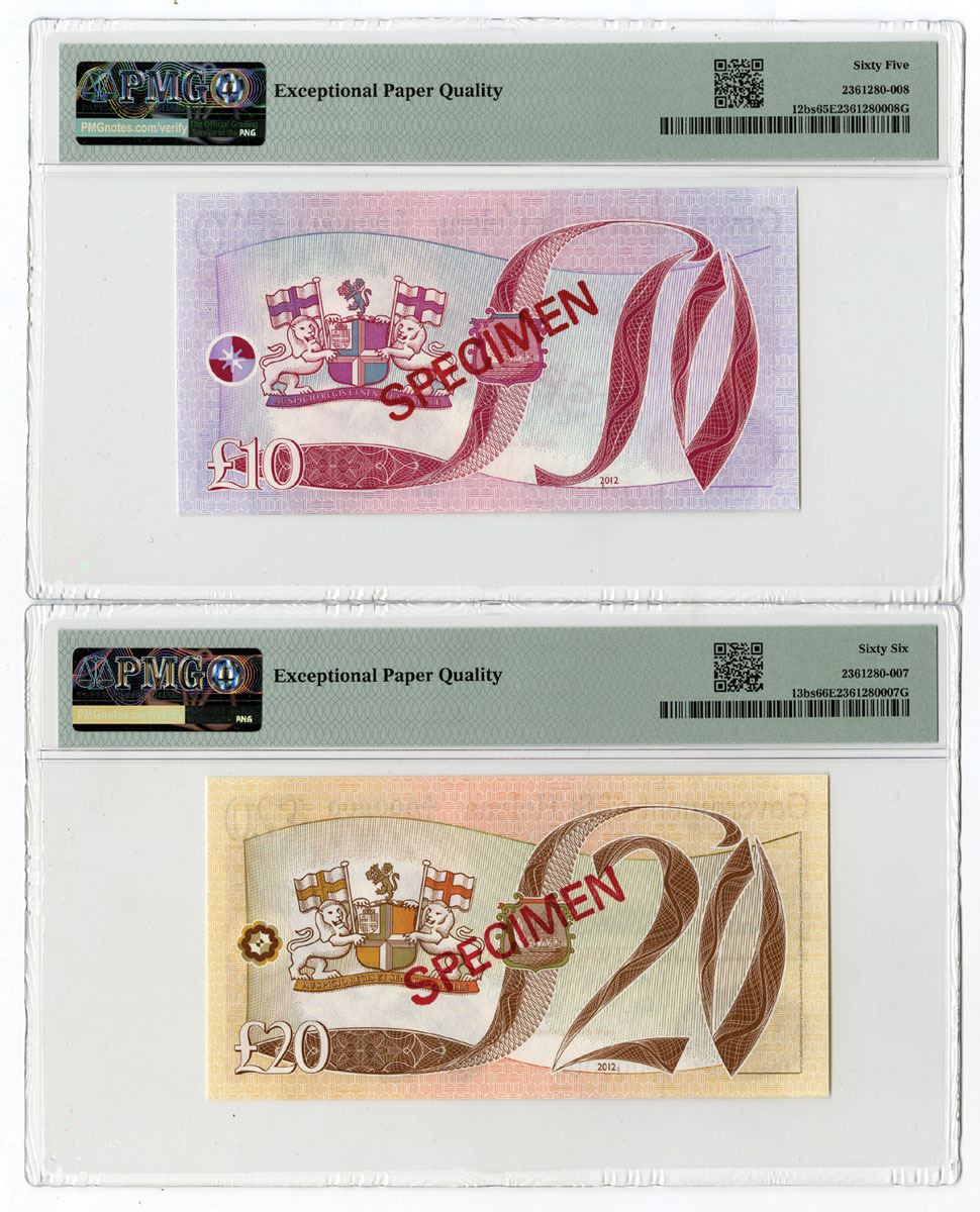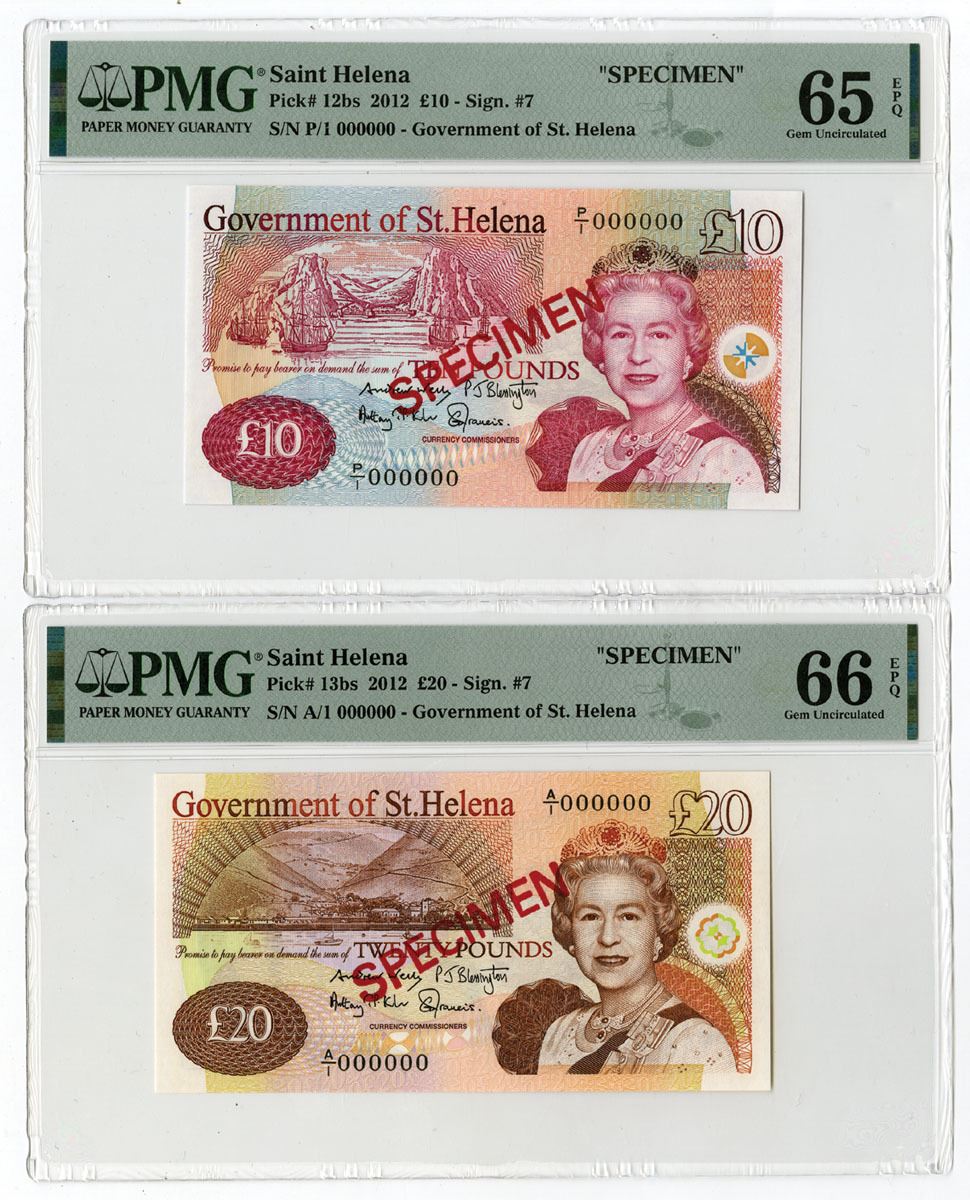 Saint Helena, 2012. Lot of 2 Specimen Banknotes, Includes: 10 Pounds, P-12bs, S/N P/1 000000, PMG graded Gem Uncirculated 65 EPQ; 20 Pounds, P-13bs, S/N A/1 000000, PMG graded Gem Uncirculated 66 EPQ. Both notes have Specimen overprints. (2). Sold "AS IS" no returns accepted.