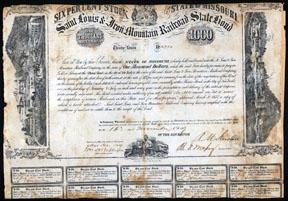 Missouri, 1857, $1,000. Issued bond. 6% stock state bond mounted on thin card. Great panorama vignettes on left and right with Missouri arms at top and iron worker on bottom, Leop Gast & Brother, lith, St. Louis, with coupons on bottom. Signed by Governor, R. M. Stewart, the builder of the Hannibal & St. Joseph Railroad. Amazing bond in amazingly bad condition, but a great space filler until a better one comes around if you are lucky.