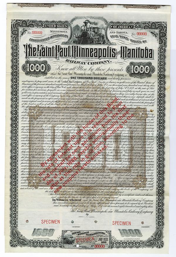 Minnesota & Dakota. $1000 Specimen 6% Consolidated Mortgage Gold Coupon Bond, Black print on black border and brown under tint, Small image of locomotive at top, Specimen overprints and POC's, VF-XF condition, ABNC.