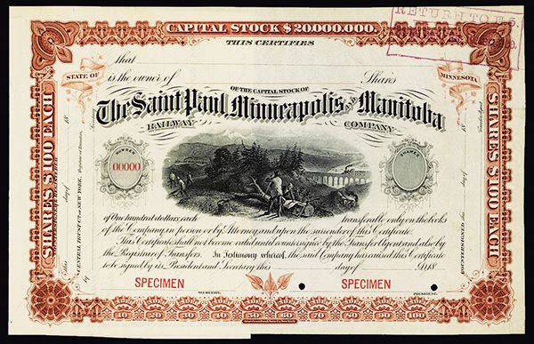 Minnesota, 18xx (ca.1893), Odd Shares, Specimen stock certificate, Red-brown border with large vignette of surveyor with small train in background over bridge, POC's, VF condition with light toning on right margin. ABNC.