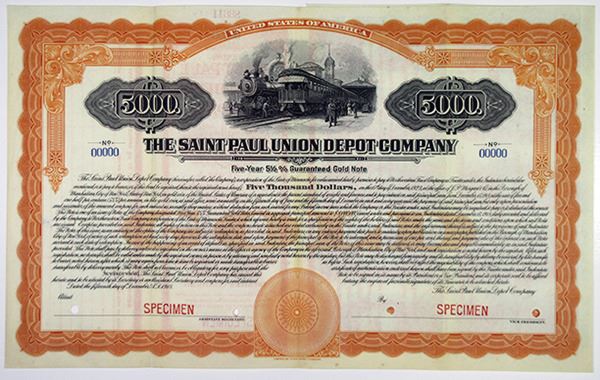 Minnesota. Lot of 2 Specimen bonds: Includes 1922 $500 Specimen Series A 5% First and Refunding Gold Coupon Bond; and 1918 $5000 Specimen 5 1/2% Guaranteed Gold Coupon Bond Note. Both are in VF condition and printed by ABNC. Both are only known as specimens in Cox.