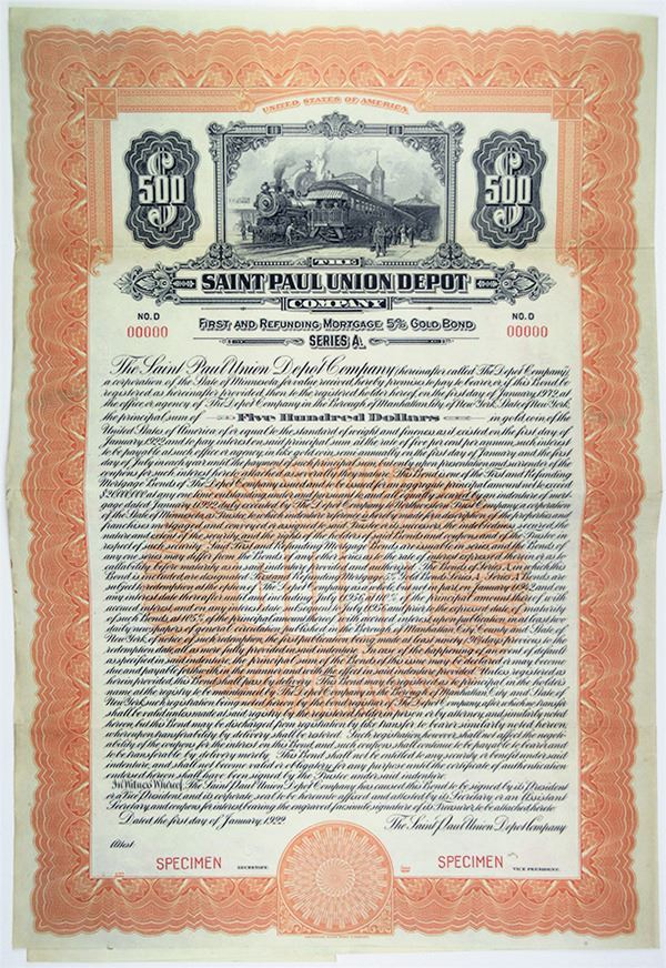 Minnesota. Lot of 2 Specimen bonds: Includes 1922 $500 Specimen Series A 5% First and Refunding Gold Coupon Bond; and 1918 $5000 Specimen 5 1/2% Guaranteed Gold Coupon Bond Note. Both are in VF condition and printed by ABNC. Both are only known as specimens in Cox.