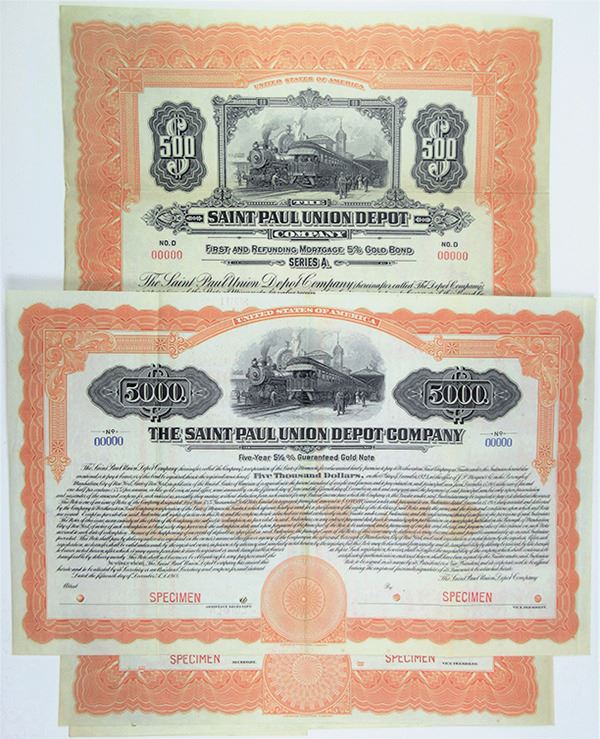 Minnesota. Lot of 2 Specimen bonds: Includes 1922 $500 Specimen Series A 5% First and Refunding Gold Coupon Bond; and 1918 $5000 Specimen 5 1/2% Guaranteed Gold Coupon Bond Note. Both are in VF condition and printed by ABNC. Both are only known as specimens in Cox.