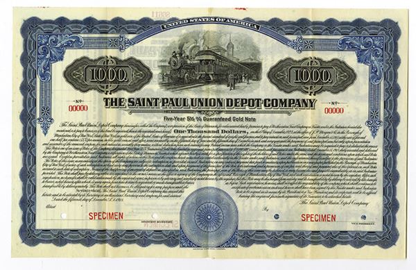 Minnesota. $1000 Specimen 5 1/2% Guaranteed Gold Coupon Bond, Black print on blue border and under tint on horizontal format, Locomotive leaving station at top, Specimen overprints and POC's, VF-XF condition, ABNC.