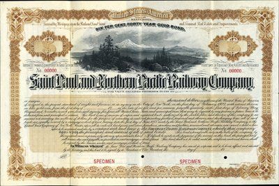Minnesota. 19--. Ca.1900-10. $ Odd. Specimen 6% Gold bond. Brown borders. Forest and mountain scene. XF condition. Red specimen overprints, POC's and "00000" serial numbers. No coupons attached. ABNC.