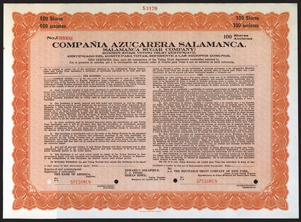 Cuba, 1923, Specimen Stock, 100 Shares, Black on orange border and underprint, No vignette, Red SPECIMEN overprints POC's and red s/n "00000", Fine condition with some discoloration, ABNC.