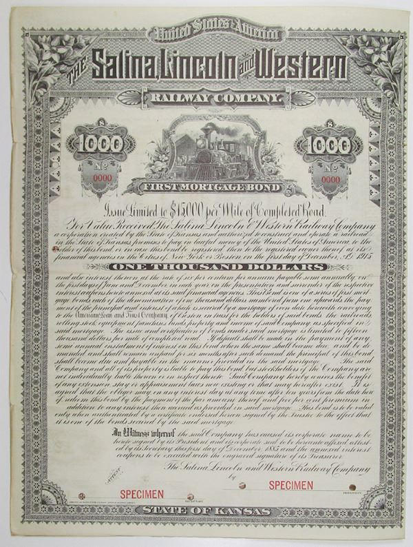 Kansas, 1885. $1000 Specimen 6% First Mortgage Coupon Bond, Black text with black border, Train by busy platform in small frame at top center. Red specimen overprints, 0000 serial numbers and POCs. VF condition, ABNC. Unlisted in specimen format in Cox, Very Rare.