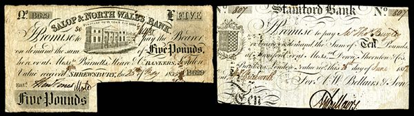 Salop & North Wales Bank, 1838 & Stamford Bank, 1812 Issued English Provincial Bank Pair. Lot of 2 notes, Includes Shrewsbury, England, 5 Pounds, Issued and cancelled obsolete English banknote with signature cut out and Stamford Bank, 1812, 10 Pounds Issued banknote with edges cut down into design, VG to Fine condition.