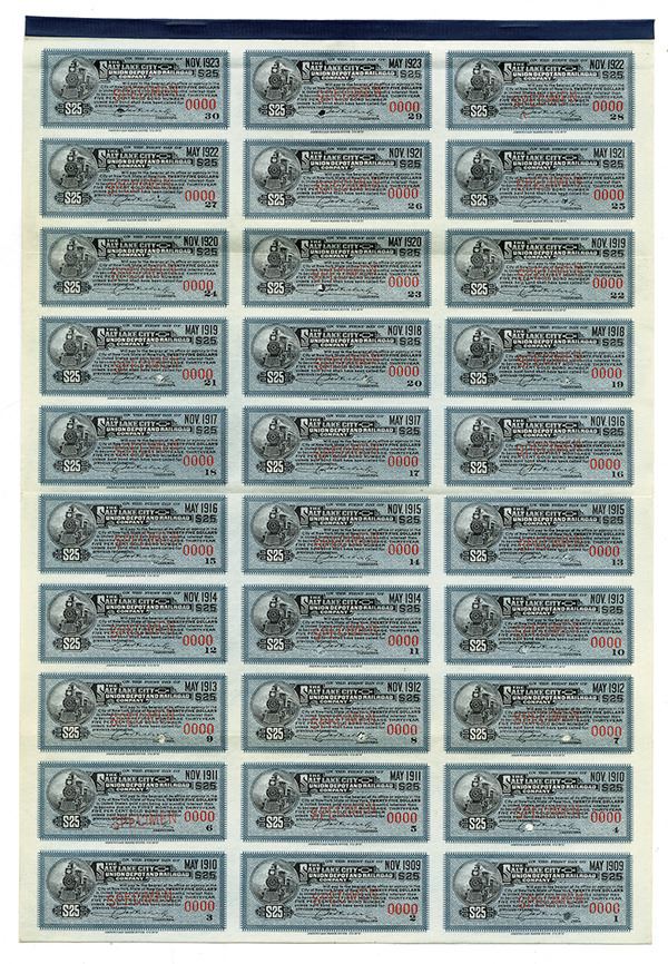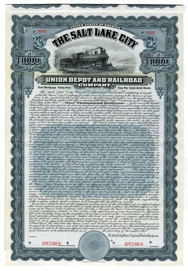 Salt Lake City, Utah. $1000 Specimen 5% First Mortgage Gold Coupon Bond. Black print with a slate blue border and under tint. Vignette of a speeding locomotive passing a lake at top. Specimen overprints, POC's, VF-XF condition with coupons attached. ABNC. Rare and attractive bond. Unlisted railroad in Cox.