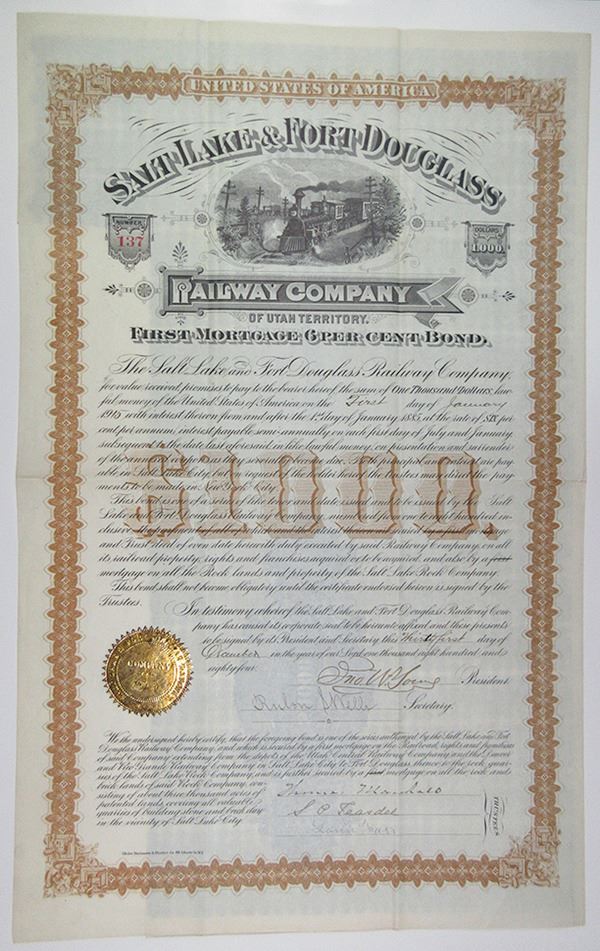 Utah Territory, December 31, 1884, $1000, I/U, 1st Mortgage 6% Bond, Black with brown border and underprint, Locomotive passes telegraph poles with small train in background, XF condition, coupons attached. Salt Lake & Fort Douglass Railway Company bond signed by John W.Young as president, Rulon S.Wells as Secretary and included his brother Brigham Young Jr. and other Mormon leaders as shareholders. John Young was born in Nauvoo, Illinois to Latter Day Saint apostle Brigham Young and Mary Ann Angell. As a young boy, John traveled with the Mormon pioneers from Illinois to Utah Territory. He was ordained an apostle by his father in 1855, when he was eleven. He was called as First Counselor to his father in October, 1876 until the First Presidency was dissolved by Brigham Young's death less than a year later in 1877. Young practiced polygamy and had 4 wives. He was arrested in Denver from a complaint of his 3rd wife from Philadelphia when he took a 4th wife in 1878. Young's business practices and practice of living in New York City soon brought him into conflict with other church authorities. In 1888, Joseph F. Smith accused Young of unethically using church funds to maintain a lavish lifestyle. He resigned from the position of counselor to the Quorum of the Twelve Apostles in 1891. Rulon S. Wells was a Utah politician and was a general authority of The Church of Jesus Christ of Latter-day Saints. Rare and historic early Mormon railroad signed by son of Brigham Young.