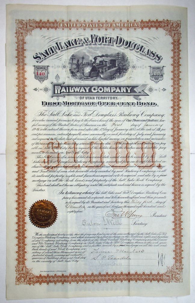 Utah Territory, 1884. $1000, I/U 6% 1st Mortgage Coupon Bond, Black with brown border and underprint, Locomotive passes telegraph poles with small train in background, S/N 140, VF-XF condition, Globe Stationary & Printing. Bond is signed by John W.Young as president, Rulon S.Wells as Secretary and included his brother Brigham Young Jr. and other Mormon leaders as shareholders. John Young was born in Nauvoo, Illinois to Latter Day Saint apostle Brigham Young and Mary Ann Angell. As a young boy, John traveled with the Mormon pioneers from Illinois to Utah Territory. He was ordained an apostle by his father in 1855, when he was eleven. He was called as First Counselor to his father in October, 1876 until the First Presidency was dissolved by Brigham Young's death less than a year later in 1877. Young practiced polygamy and had 4 wives. He was arrested in Denver from a complaint of his 3rd wife from Philadelphia when he took a 4th wife in 1878. Young's business practices and practice of living in New York City soon brought him into conflict with other church authorities. In 1888, Joseph F. Smith accused Young of unethically using church funds to maintain a lavish lifestyle. He resigned from the position of counselor to the Quorum of the Twelve Apostles in 1891. Rulon S. Wells was a Utah politician and was a general authority of The Church of Jesus Christ of Latter-day Saints. Rare and historic early Mormon railroad signed by son of Brigham Young.
