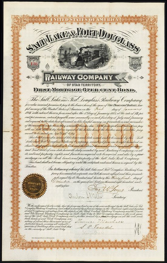 Utah Territory, December 31, 1884, $1000, Issued and uncancelled, 1st Mortgage 6% Bond, Black with brown border and underprint, Locomotive passes telegraph poles with small train in background, XF condition, coupons attached. Salt Lake & Fort Douglass Railway Company bond signed by John W.Young as president, Rulon S.Wells as Secretary and included his brother Bringham Young Jr. and other Mormon leaders as shareholders. John Young was born in Nauvoo, Illinois to Latter Day Saint apostle Brigham Young and Mary Ann Angell. As a young boy, John traveled with the Mormon pioneers from Illinois to Utah Territory. He was ordained an apostle by his father in 1855, when he was eleven. He was called as First Counselor to his father in October, 1876 until the First Presidency was dissolved by Brigham Young's death less than a year later in 1877. Young practiced polygamy and had 4 wives. He was arrested in Denver from a complaint of his 3rd wife from Philadelphia when he took a 4th wife in 1878. Young's business practices and practice of living in New York City soon brought him into conflict with other church authorities. In 1888, Joseph F. Smith accused Young of unethically using church funds to maintain a lavish lifestyle. He resigned from the position of counselor to the Quorum of the Twelve Apostles in 1891. Rulon S. Wells was a Utah politician and was a general authority of The Church of Jesus Christ of Latter-day Saints. Rare and historic early Mormon railroad signed by son of Brigham Young.