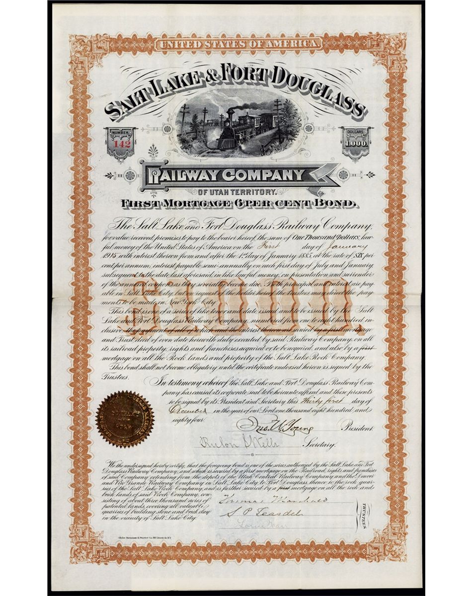 Utah Territory, December 31, 1884, $1000, Issued and uncancelled, 1st Mortgage 6% Bond, Black with brown border and underprint, Locomotive passes telegraph poles with small train in background, XF condition, coupons attached. Salt Lake & Fort Douglass Railway Company bond signed by John W.Young as president, Rulon S.Wells as Secretary and included his brother Bringham Young Jr. and other Mormon leaders as shareholders. John Young was born in Nauvoo, Illinois to Latter Day Saint apostle Brigham Young and Mary Ann Angell. Rare and historic early Mormon railroad signed by son of Brigham Young.