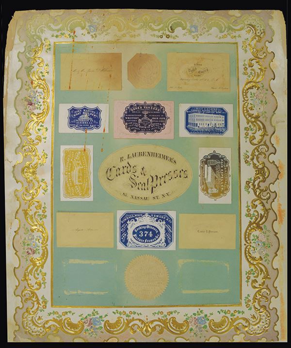 Sample display incorporating engraved business cards, corner cards and embossed seals. 13 items mounted on larger embossed frame card. Formerly framed, some discoloration to at least three of the cards. 17x19 inches. Includes 6 Cameo Business Cards on White Card or Coated Stock.