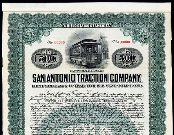 San Antonio, Texas, 1908, $500, Specimen, 1st Mortgage 41 Year 5% Gold Bond. Black with green border and underprint, Electric street car "121". XF condition. Coupons attached. Red specimen overprints, POC's and "00000" serial numbers. Rare and attractive bond. Unlisted railroad in Cox. ABNC.
