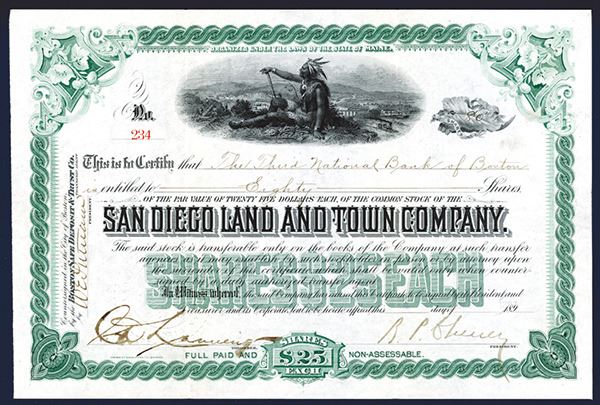 California. 80 Shares Common Stock, I/U Certificate. Black print with green border and under print. Vignette at top center of certificate of a sitting native American with miners on the left and locomotive in the distance. VF condition, ABNC.
