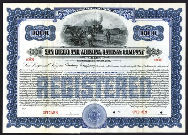 San Diego, CA. $10,000 1st Mortgage 6% Registered Gold Bond, Men working with locomotive passing in background, blue border, XF, ABNC. This is the only certificate type in Cox and is only known as specimen.