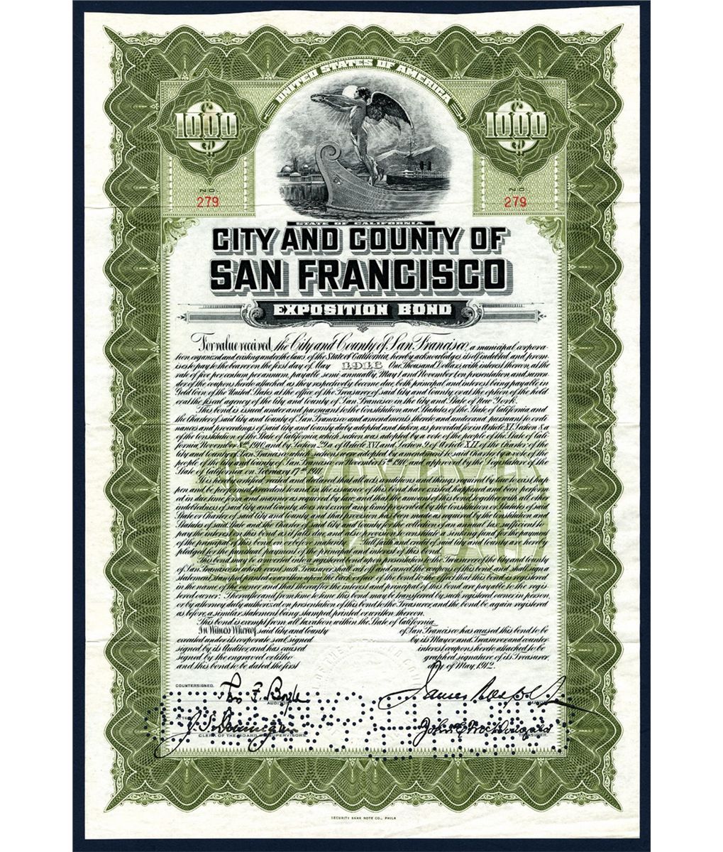 San Francisco, CA. May 1912. Issued and cancelled $1000. Exposition Bond, olive green. No coupons attached. Vignette of angel standing on bow of wooden ship with steamship and exposition grounds behind. The Panama-Pacific International Exposition was a world's fair held in San Francisco, California between February 20 and December 4 in 1915. A specimen of this bond was sold in our first auction in January 2007 for over $900. Signed by Mayor James Rolf who also piloted the first San Francisco street car in 1912.