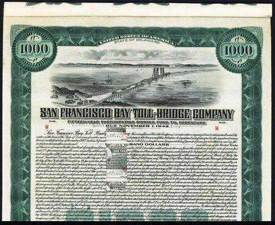California, 1927, $1000, 15 Year Participating Sinking Fund 7% Debenture, Specimen bond with coupons attached, Black on green border and underprint, Archival copy with small rectangle cut out in center vignette of the bridge top center with automobiles driving through toll to proceed over bridge, Red SPECIMEN overprints and POC's, VF condition other than cutout, SBNC. Unique vignette and only one found in archive.