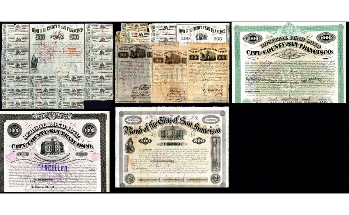 Lot of (12) Bonds. San Francisco, CA. Includes San Francisco City Stock, 1851, (2) $500, (1) $1,000 I/C, 10%, Signed as Commissioners by: P. Morse, L. Tallant, William Hooper and others, dock seen; Bond of the County of S.F. 1852 includes $100, $200, $500 bonds, allegorical women in top, Washington on LL; Bond of the City of S.F. 1855, $500; City and County of S.F. "Dept. of Public Instr.", 1860, $500; City and County of S.F., 1861, "Dept of Public Instr.", $500; City and County of S.F., 1867, (1), $1,000; Bond of the City and County of S.F., 1867, $1000; Hospital Fund Bond City and County of S.F., 1871, $1,000, No coupons, ornate hospital building across the entire bottom of the bond; School Bond 1872, City and County of S.F., $1000, No coupons attached; Various quantities of Coupons attached to each bond, some bonds also contain accompanied detached coupons. Choice Fine to VF condition, attractive and rare. A number of these varieties have not been seen in years. (12)