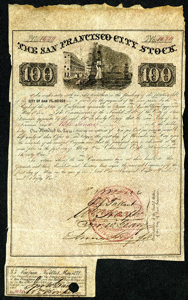 San Francisco City Stock, 1851 Gold Rush Era Bond with Hooper, Geary, King & Tallant Signatures. San Francisco, CA. 1851, $100, Signed as Commissioners by: P. Morse, L. Tallant, William Hooper, John Geary and others, ship at wharf, 1 coupon attached. Choice Fine to VF condition, attractive and rare.
