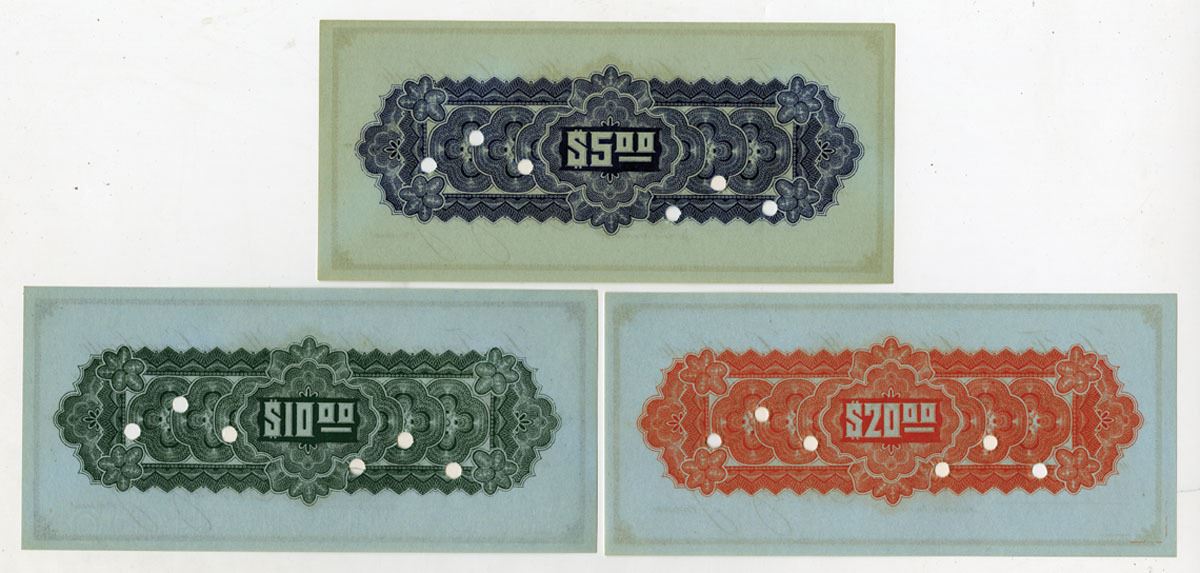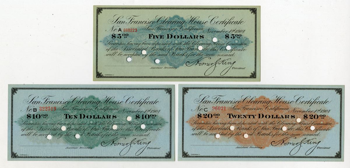 San Francisco, California, 1907. Lot of 3 Scrip Notes, Includes: $5 with blue underprint, S/N 668223; $10 with green underprint, S/N 322519; $20 with orange underprint, S/N 96021. Each notes is punched out Cancelled, VF to XF condition. Certificate was used during the panic of 1907 when banks were low on physical cash and in which banks and other firms limited their cash payments, of the issue of loan certificates in the clearinghouses of the country, and of the ingenious invention of multifarious other substitutes for legal currency. Lith. Britton & Rey. (3). Sold "AS IS" no returns accepted.