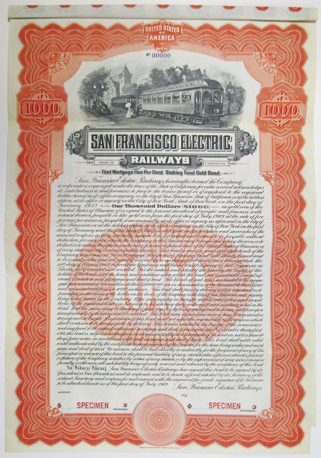 California, 1909. $1000 Specimen 5% First Mortgage Sinking Fund Gold Coupon Bond, Black text with orange border and undertint, Passenger exiting streetcar in town at top center. Red specimen overprints, 00000 serial numbers, and POCs. VF condition, ABNC. Unlisted bond in Cox, no examples are provided. Only 2 examples found in the ABN Archives.