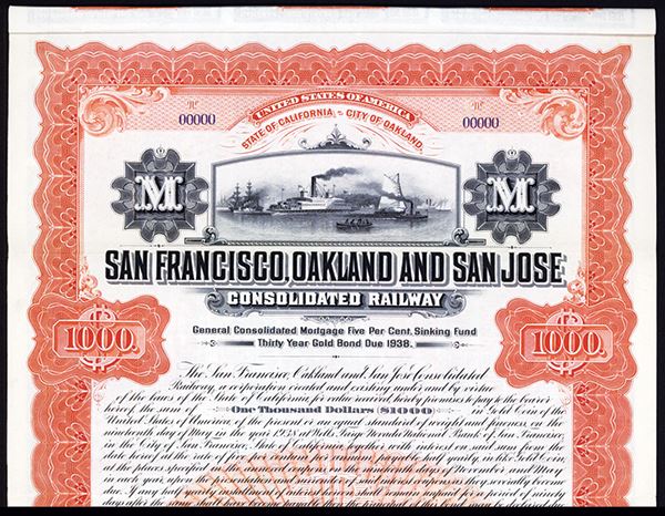 San Francisco, California, 1908, $1000, Gen. Consolidated Mortgage 5% Gold Bond. Orange border and undertint. Harbor scene with ferry boat and other ships. XF condition. Coupons attached. Red specimen overprints and POC's. ABNC. Listed railroad, but unlisted as a bond in Cox, only as a stock. Rare and attractive California railroad bond.