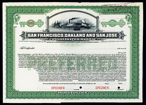 California, 19xx, Specimen Stock, Odd Shares, Black on green border and underprint, Ships at sea vignette top center, POC's and red SPECIMEN overprints, VF condition, ABNC.