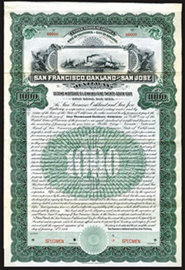 Oakland, CA. $1000 Second Mortgage 5% Sinking Fund Gold Coupon Bond, Harbor scene with ferry, sail boats and steam boats in busy harbor scene flanked by Gryphons, Green border, XF, ABNC. Unlisted railroad in Cox.